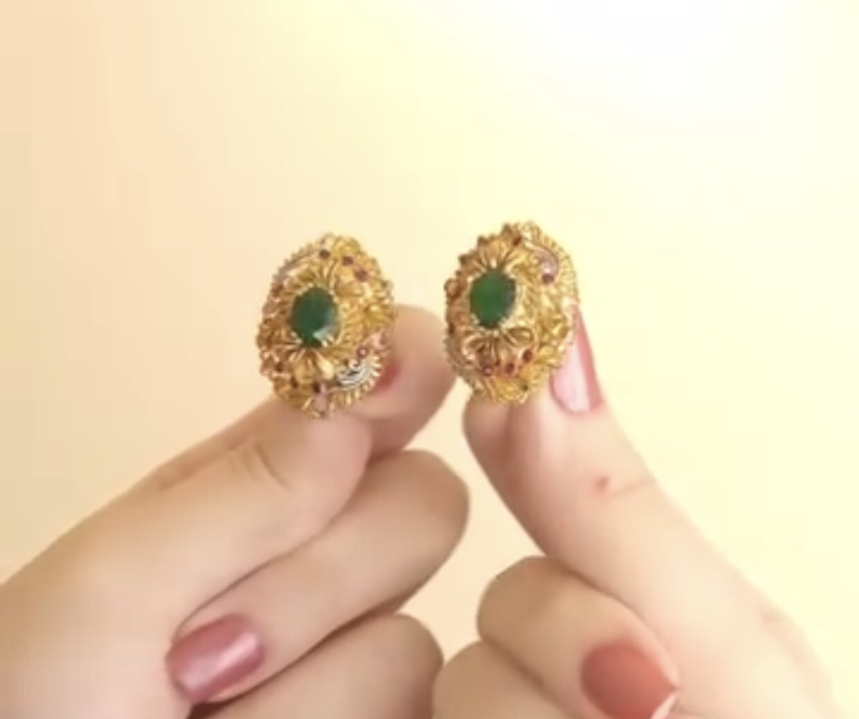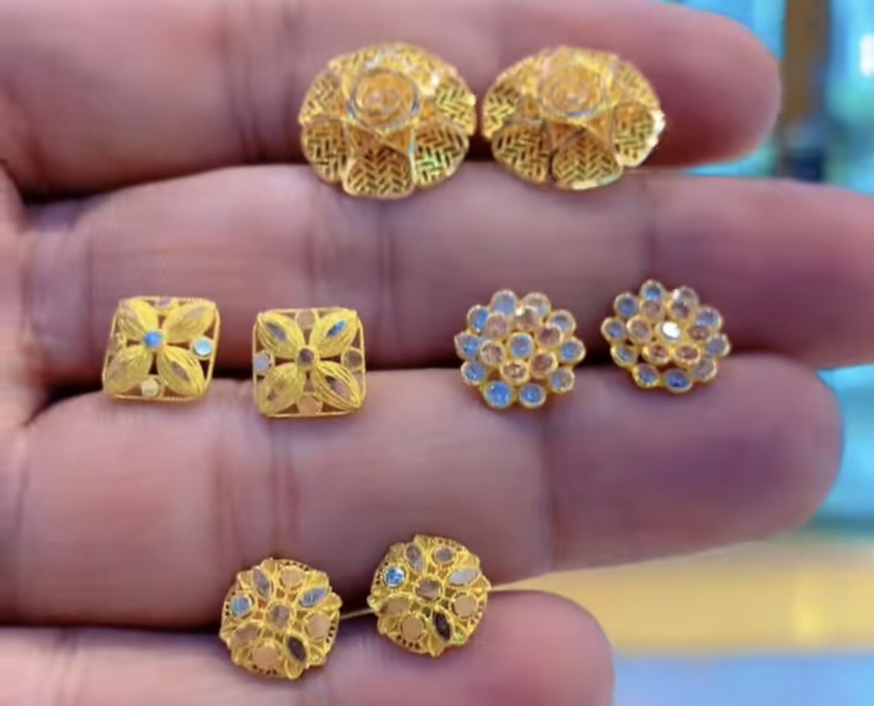 Simple, round, or floral shapes that hug the earlobe, perfect for everyday elegance. Often crafted in 22K or 24K gold, these are prized for their purity and understated appeal.