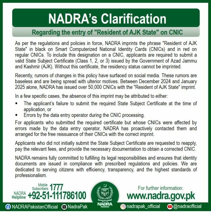 NADRA clarified that between December 2024 and January 2025, over 50,000 CNICs with the “Resident of AJK State” imprint were successfully issued. The rumors suggesting that the policy has changed or that this imprint will no longer be issued are baseless and have been dismissed by the authority. NADRA also emphasized that it remains steadfast in upholding its commitment to serving the Kashmiri community with transparency and professionalism.