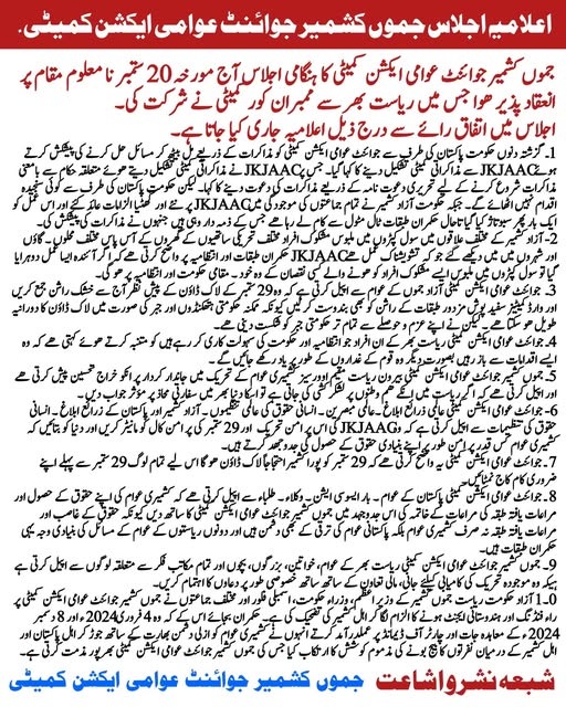 - Call for Solidarity: JKJAAC appeals to Pakistanis, lawyers, students, and citizens from all walks of life to support the Kashmiri struggle financially, physically, and spiritually.