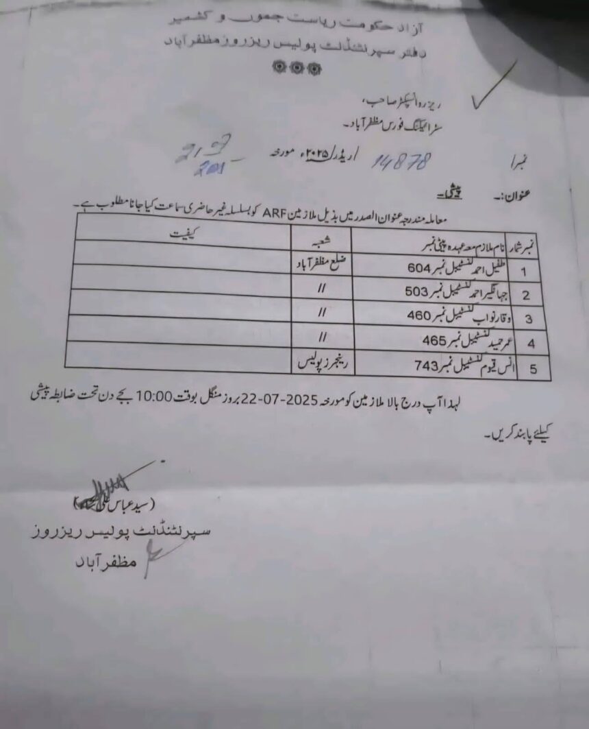 As part of the crackdown, five members of the Muzaffarabad Anti-Riot Force were issued show-cause notices. Addressing officers, the IG accused “a few individuals” of orchestrating the protest and assured that notification addressing grievances would be issued within two weeks. He also implicitly warned of further disciplinary measures if the protest continued.