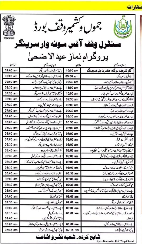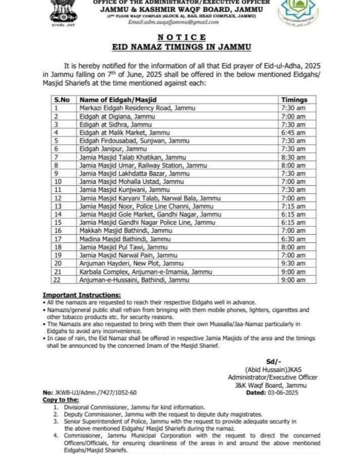 Jammu/Srinagar | Indian administered Kashmir – The Jammu and Kashmir Waqf Board has officially announced the Eid-ul-Adha 2025 Namaz (prayer) schedule for various regions across the Union Territory, including the cities of Jammu and Srinagar.