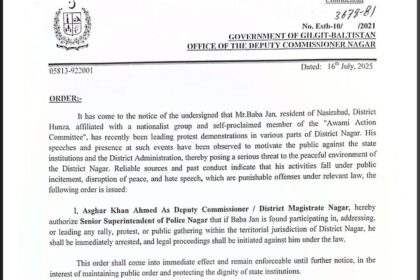 Gilgit, (GB) Pakistan administered Kashmir: In a concerning development, the Deputy Commissioner of Nagar district in Gilgit-Baltistan has issued a notification authorizing the arrest...