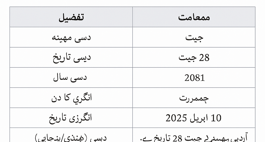 آج کا دن جمعرات ہے، اور انگریزی تاریخ 10 اپریل 2025 ہے۔ اس دن کو دیسی کیلنڈر کے مطابق 28 چیت 2081 کہا جاتا ہے، جو روایتی دیسی تاریخ کے مطابق ہے۔